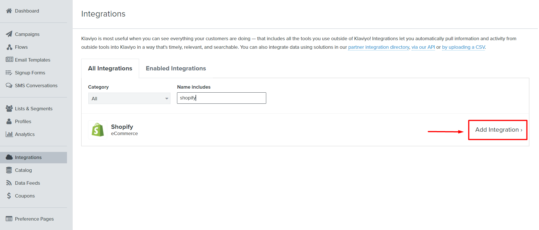 This will bring you to the Integrations page listing all available integrations. Search for the Shopify Integration. Once you find it, click on Add Integration.
