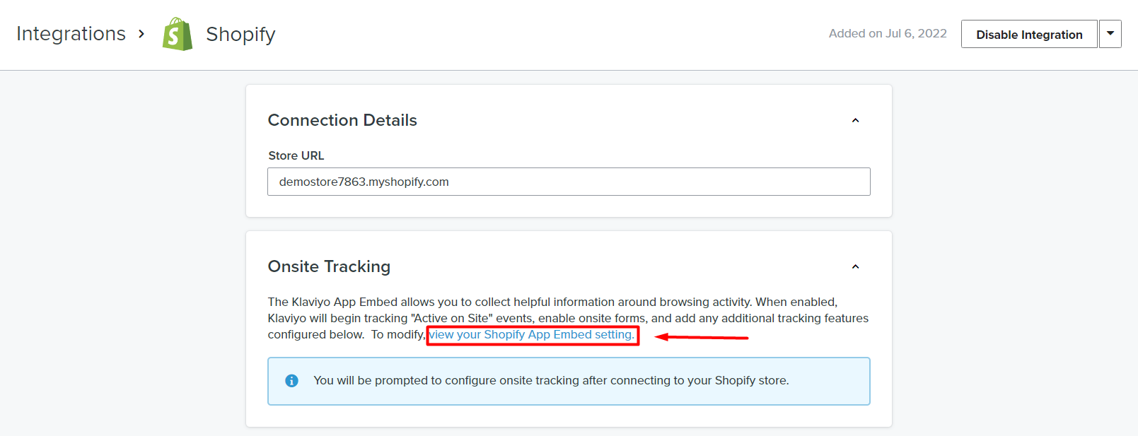 Navigate back to the integration settings page in Klaviyo. You should see a message stating that your Klaviyo app embed isn't enabled yet.