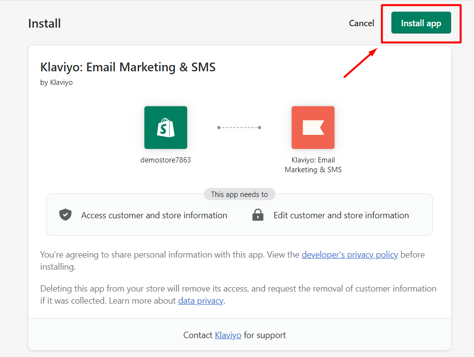 You should now be in Shopify and see a prompt to install the Klaviyo App in Shopify. Review the permissions and click the green Install app button.