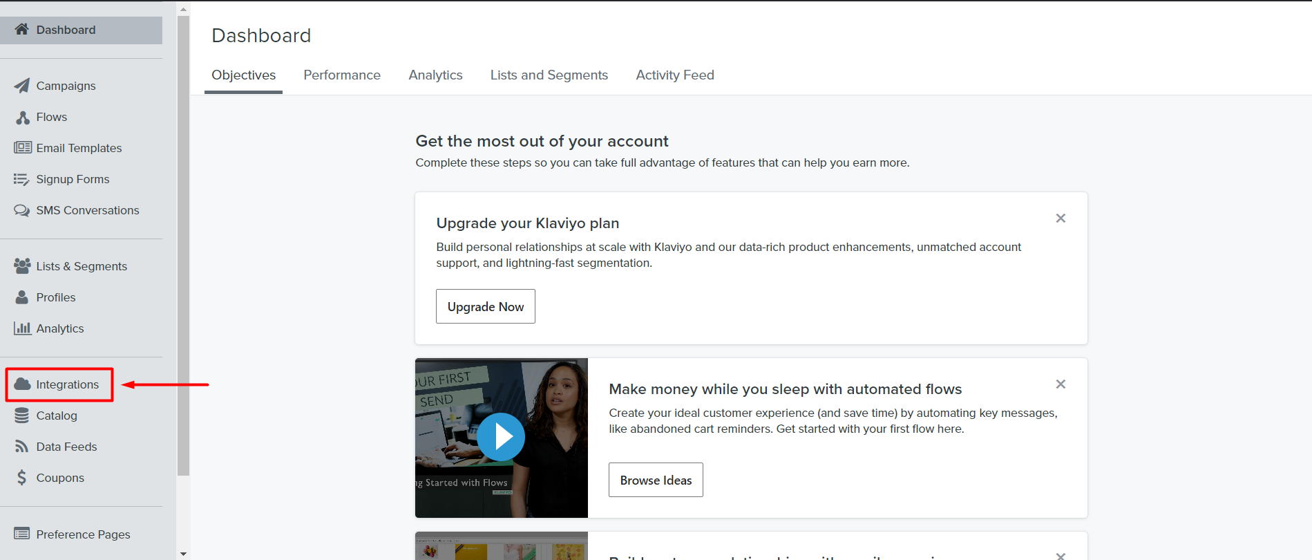 Sign in to your Klaviyo account and click on Integrations in the left menu.