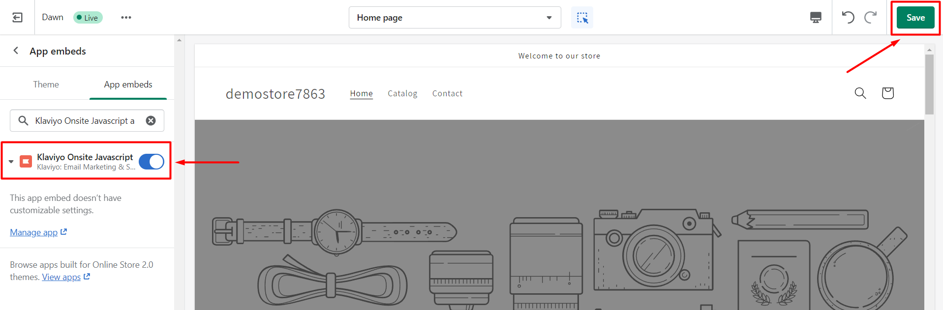 The final step is to enable onsite tracking by toggling on the Klaviyo app embed within Shopify.