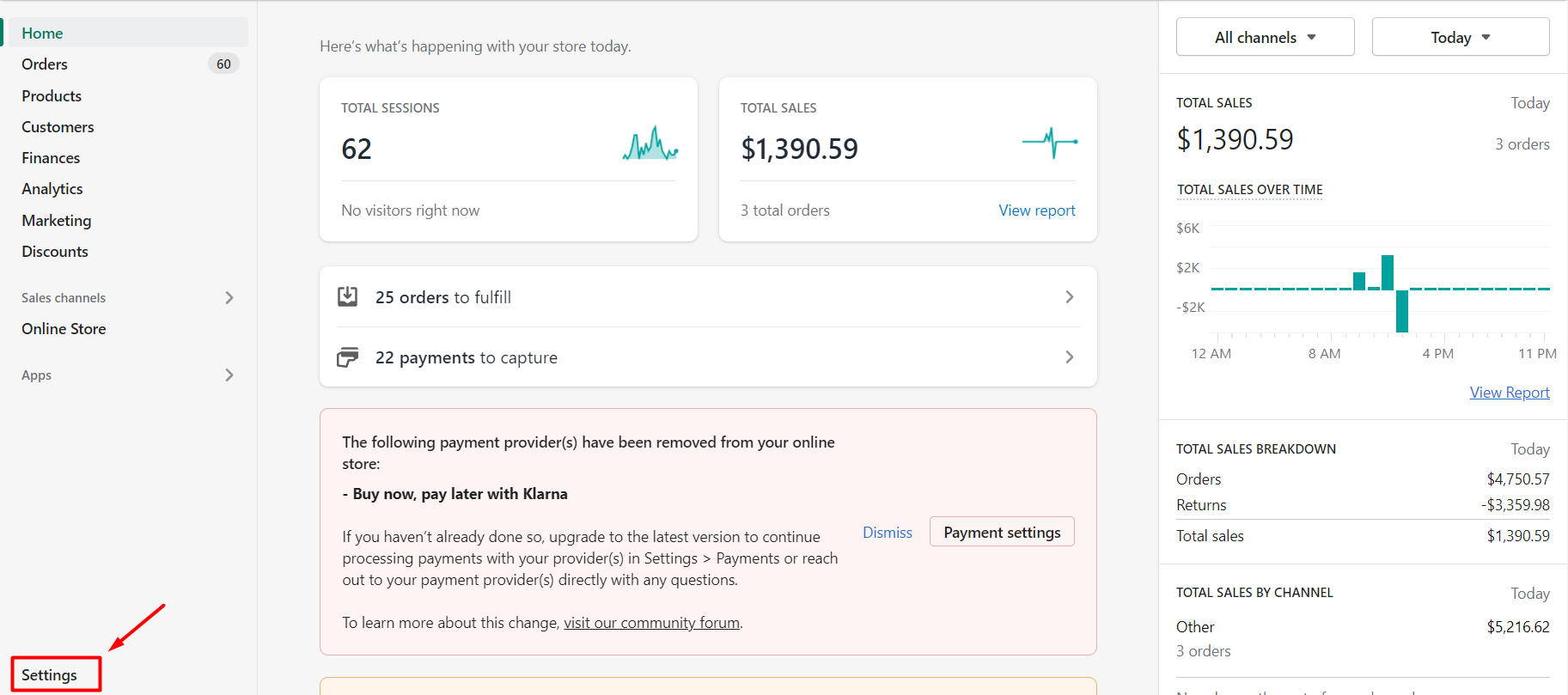 - Log in to your Shopify admin and click Settings.
