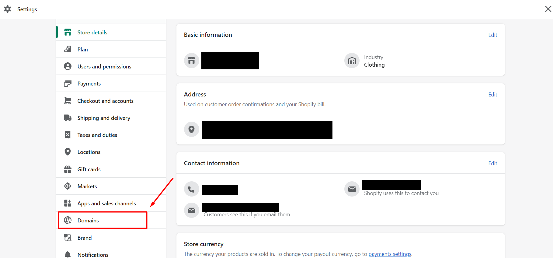 - Log in to your Shopify Admin and click Settings, then Domains