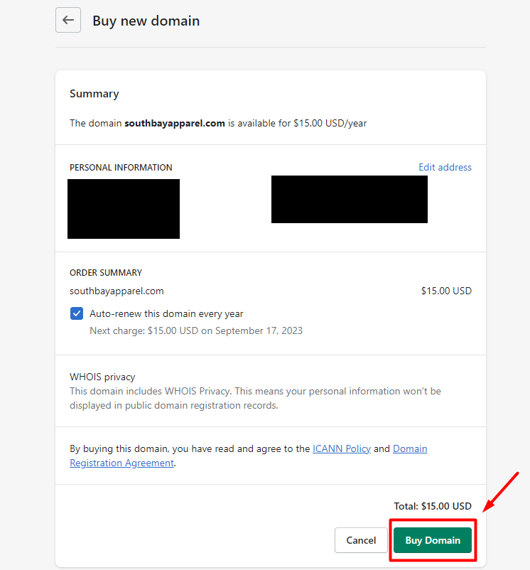 - If everything looks good, click the Buy Domain button.