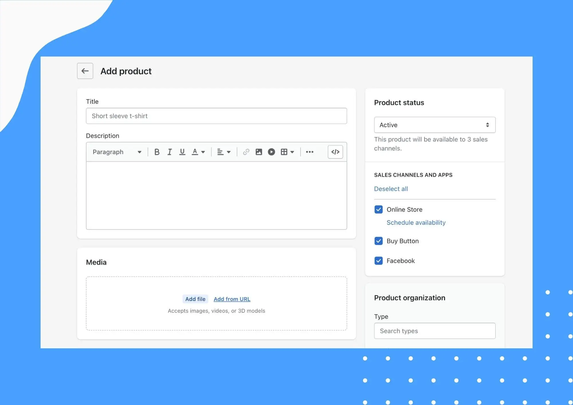 Your Shopify store is pointless without products to sell! You'll need to add the names, descriptions, photos, and pricing information for each item you sell.