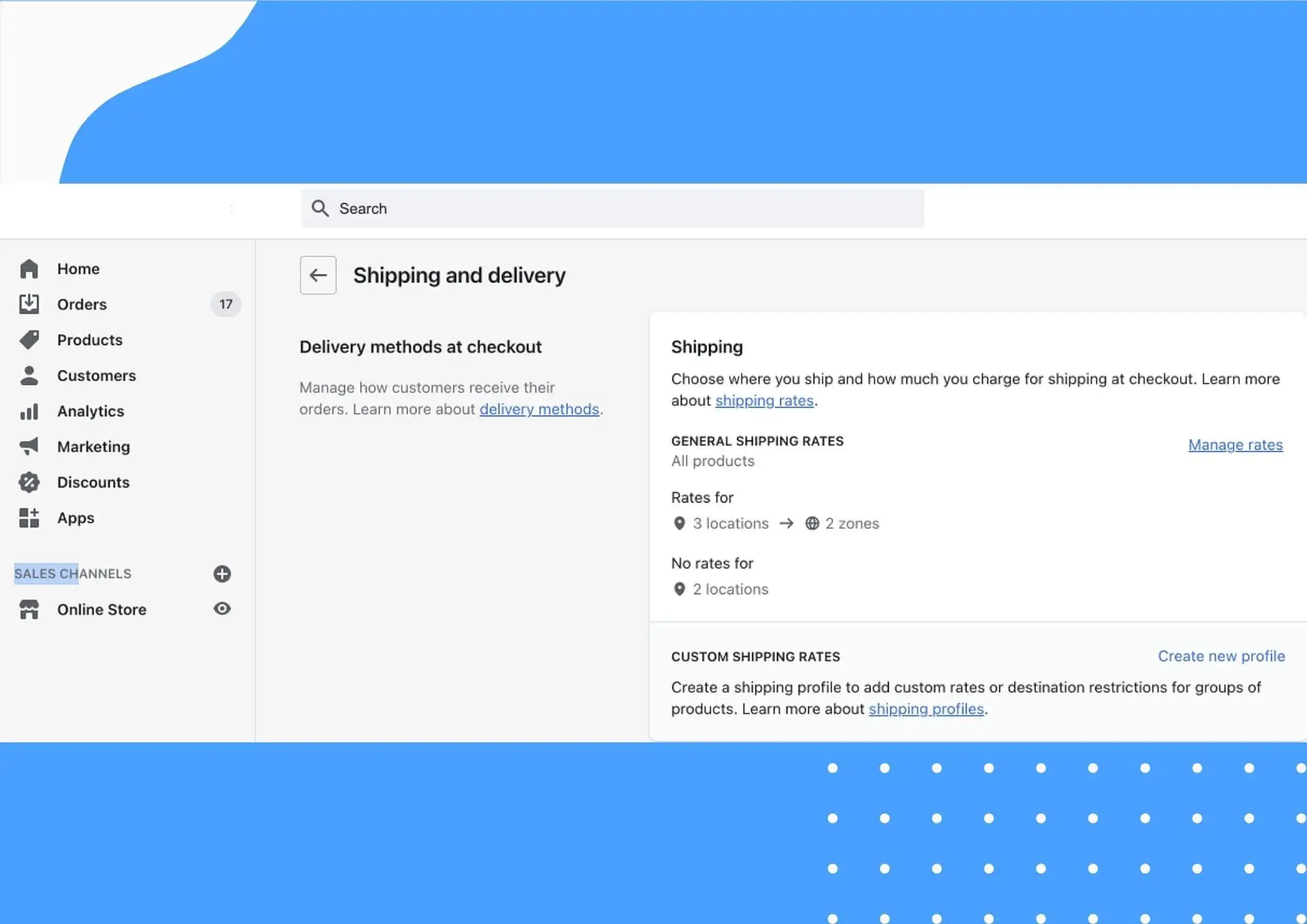 You'll need to configure your shipping options and rates if you plan on selling and shipping physical goods. You can do this in Shopify by navigating to your Shopify Admin dashboard, clicking Settings, then Shipping and delivery.