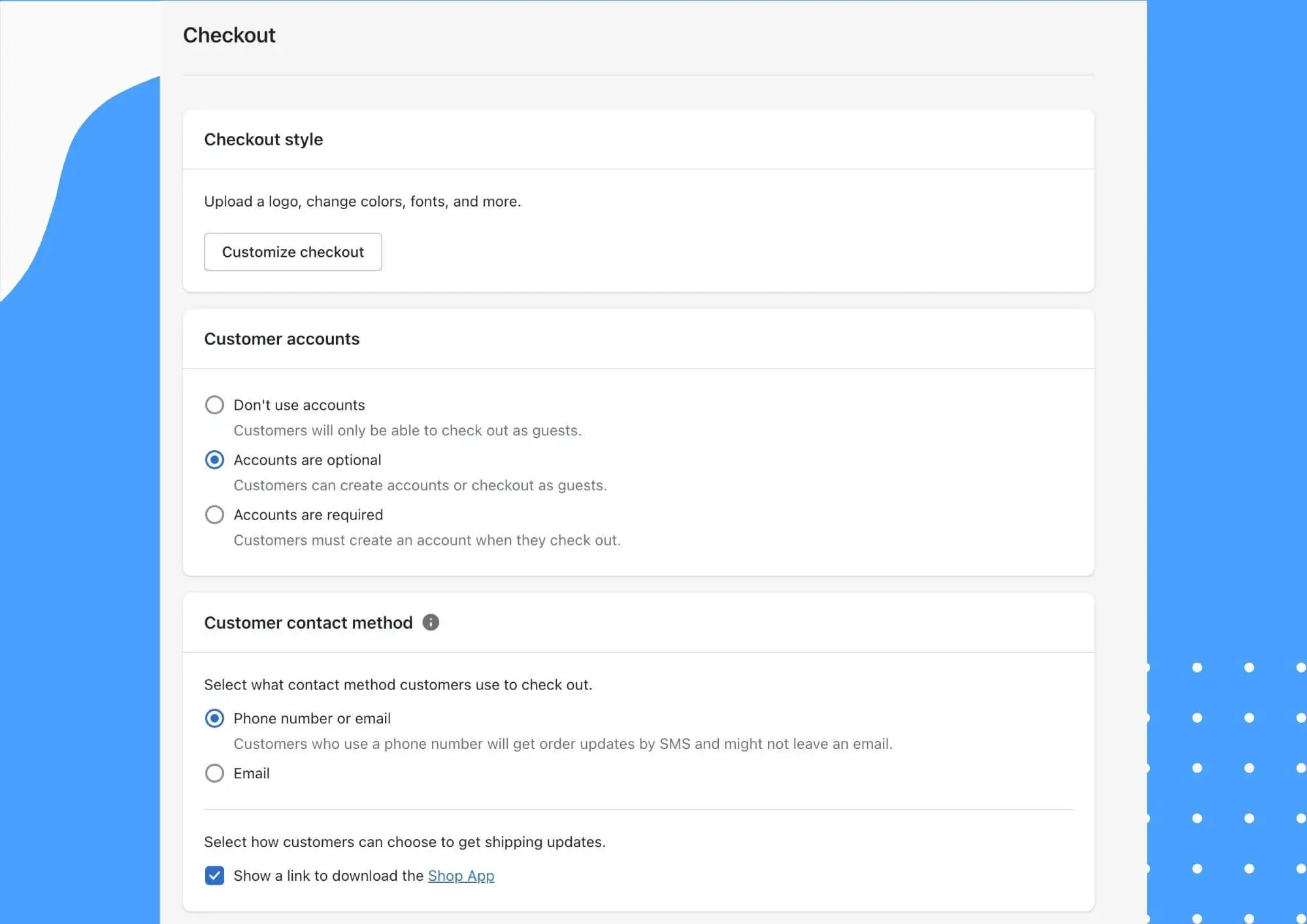 You'll find a section called Checkout and accounts within Shopify's settings (Shopify Admin > Settings > Checkout and accounts). Here, you can choose how to allow customers to checkout from your store. For example, you can select what pieces of information a customer must provide to complete checkout.