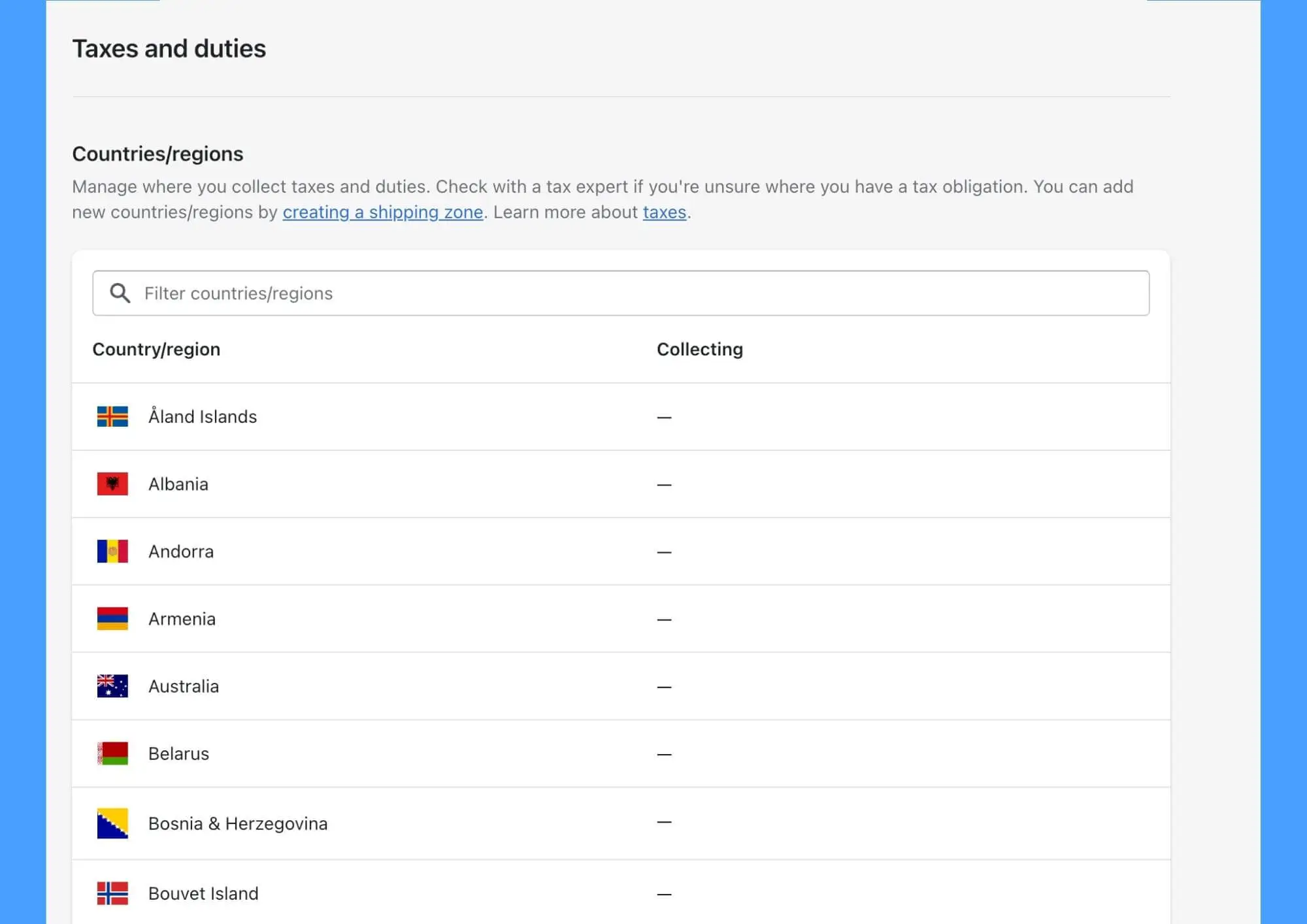 Depending on your business and where you're selling your products, you may need to collect taxes and duties. You can find these settings under the Taxes and duties section in Shopify. You can configure the tax settings for each country and region where you do business.