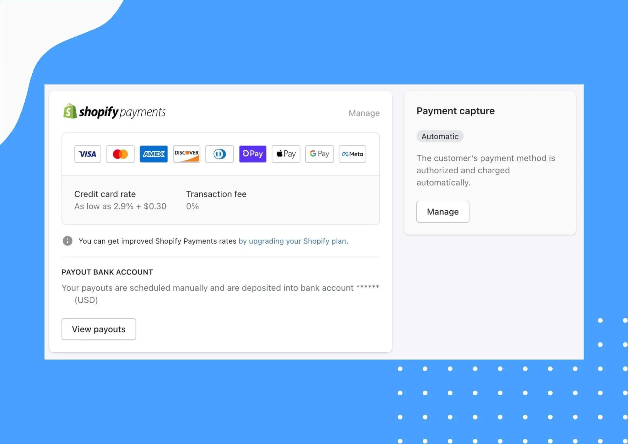 Finally, you'll need to understand how you will receive your payouts. If you use Shopify Payments on your store, Shopify can direct deposit your payouts into your bank account. If you use another payment processor, like Stripe, you will receive payouts directly from them instead of Shopify.