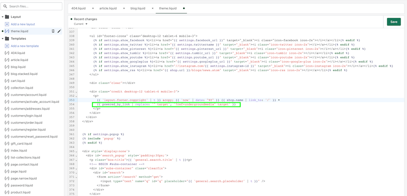 - Scroll down and look for the text "Powered by Shopify" and change it to anything else you would like.