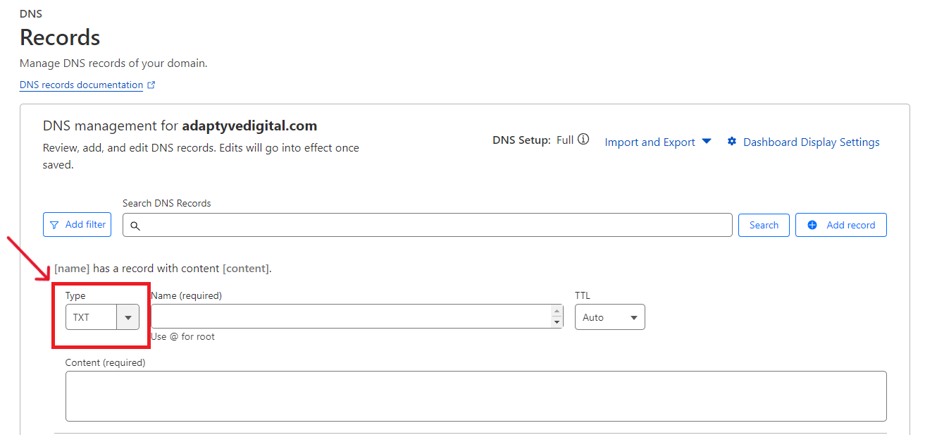 Within your DNS manager, create a TXT record. Here in Cloudflare, we'll choose TXT in the Type field to indicate we want to create a TXT record.