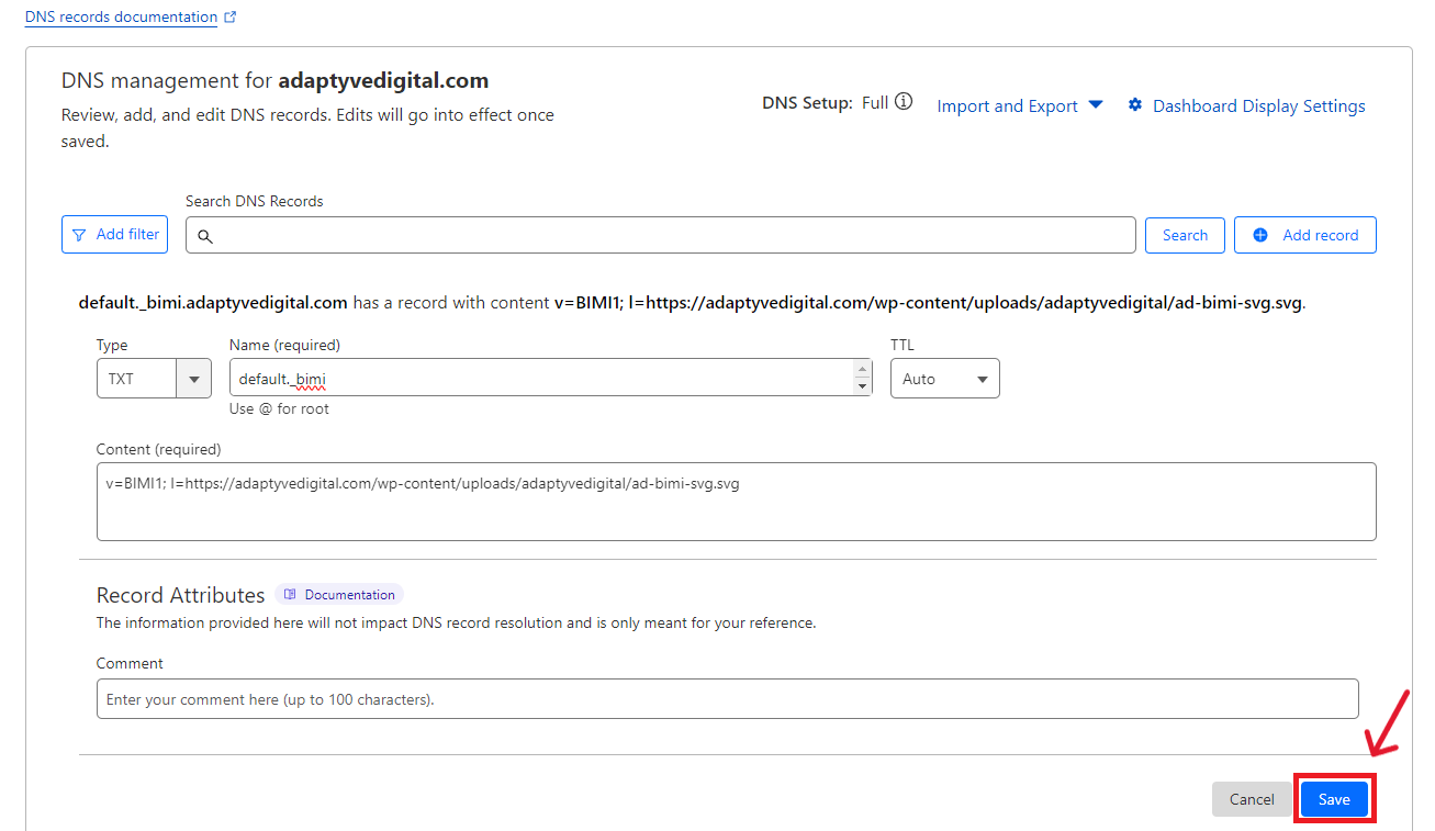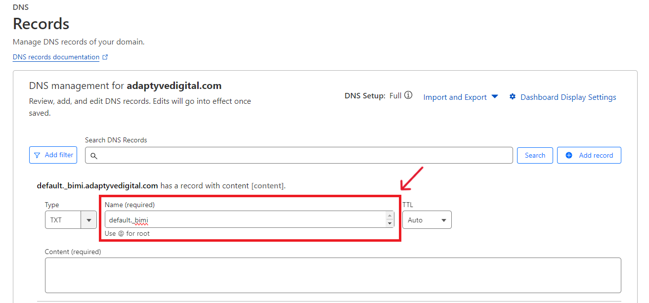Next, in the Name field, enter default._bimi