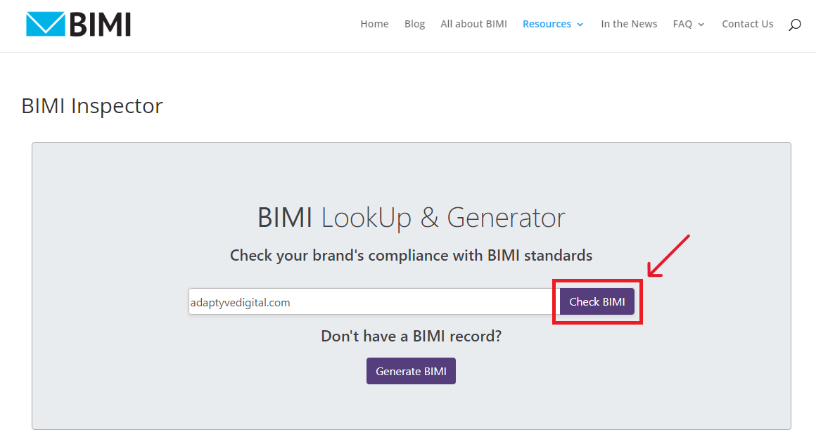 Next, use a BIMI lookup tool to verify your DNS record is set up correctly. Enter your domain name and click Check BIMI. After a few seconds, it will pull your DNS records and let you know if everything looks good.