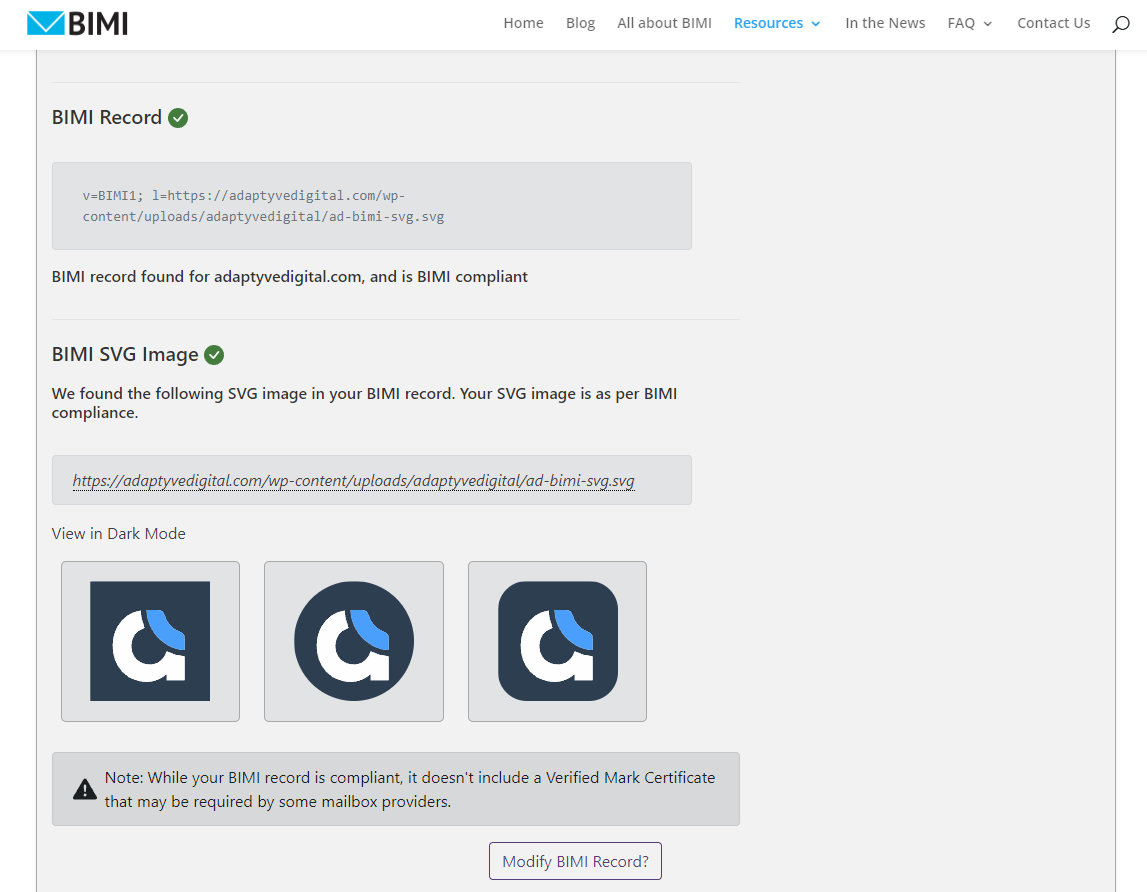 On the results page, scroll down towards the bottom to the BIMI Record and BIMI SVG Image sections. If everything is set up correctly, you'll see green check marks and you'll see the tool is able to pull your BIMI logo.