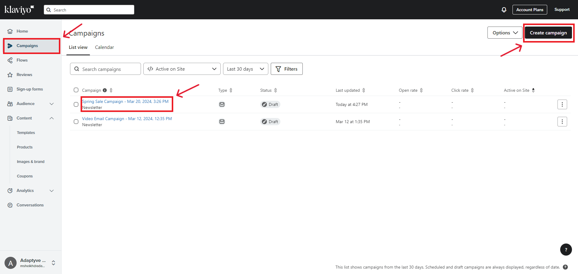 - In Klaviyo, click "Campaigns" in the left-hand menu. Select an existing campaign or click the "Create campaign" button. If you're creating a new campaign, enter the campaign details.