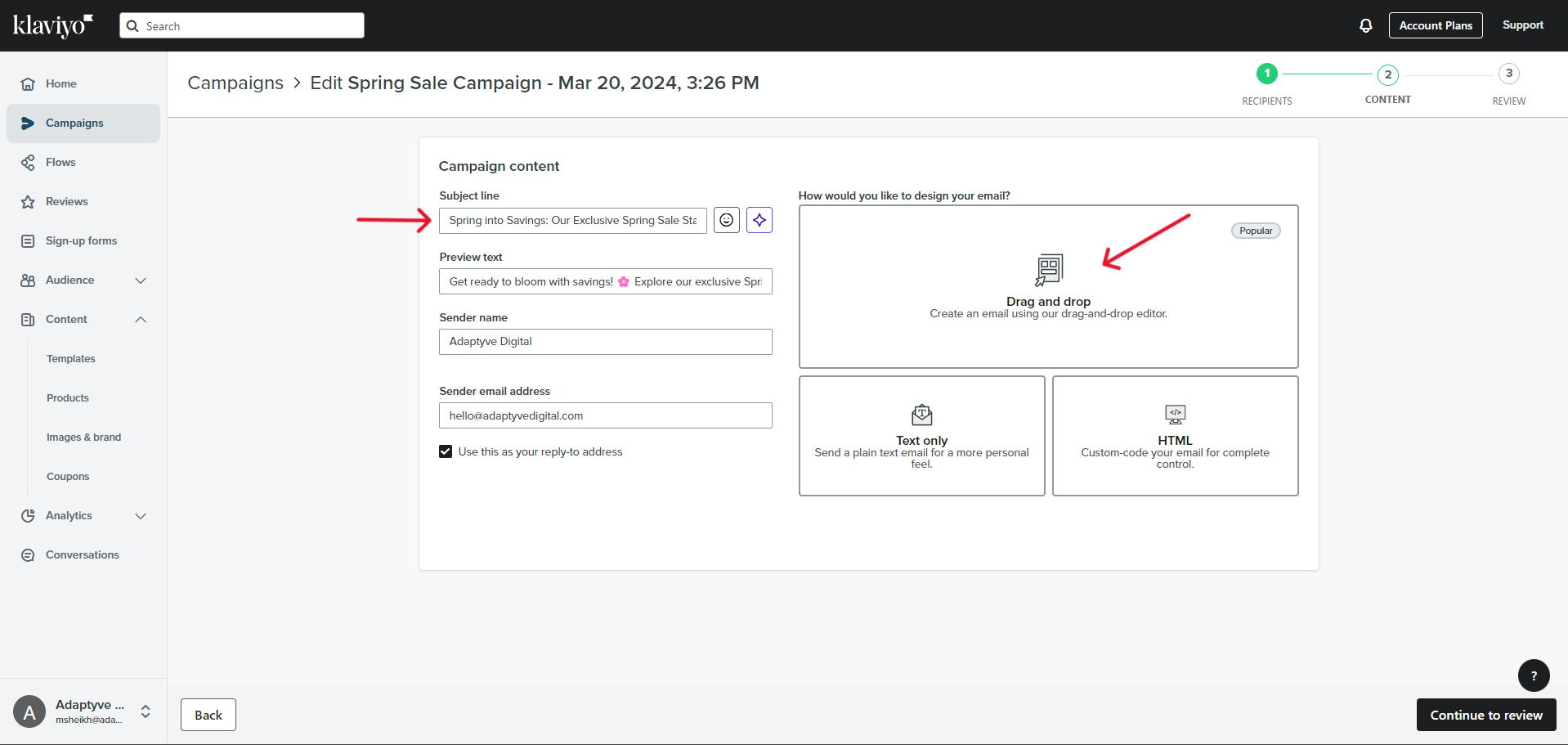 - On the Campaign content page, enter the subject line, preview text, sender name, and sender email address. Next, choose the "Drag and drop" option to design your email and select a template.
