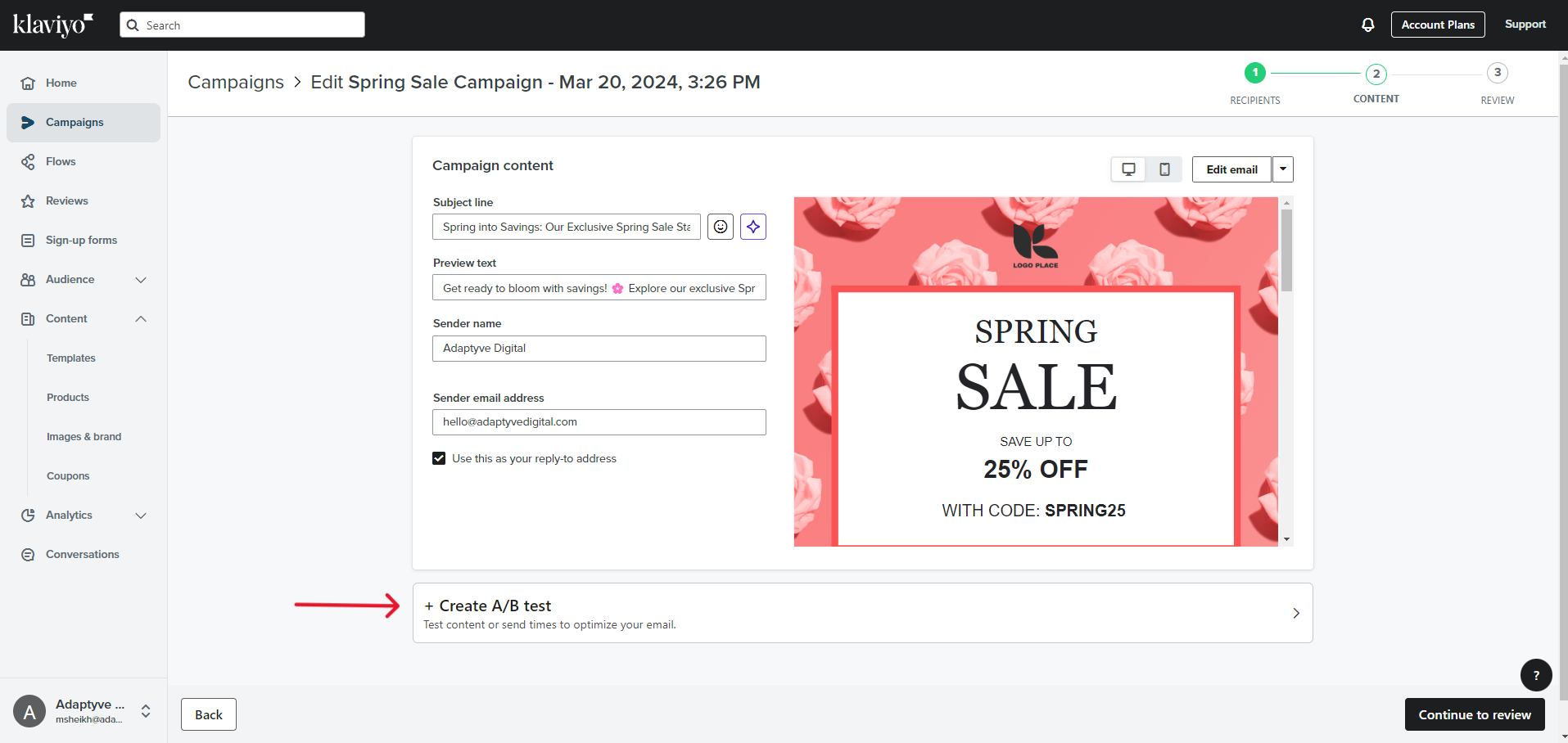 - You should now be back on the Campaign content page. At the bottom of the page, click "Create A/B test."