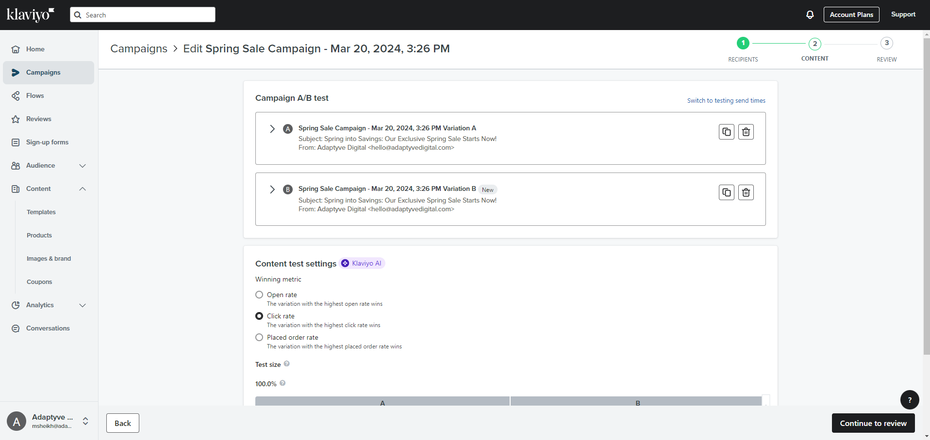 During your A/B test, keep an eye on key metrics like open rates, click-through rates, and conversion rates. Klaviyo's analytics tools make it easy to track these metrics in real time, allowing you to see how each version of your email is performing. With this information, you can make informed decisions to improve your email performance and engagement.