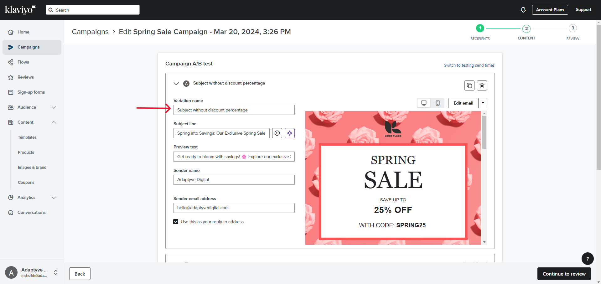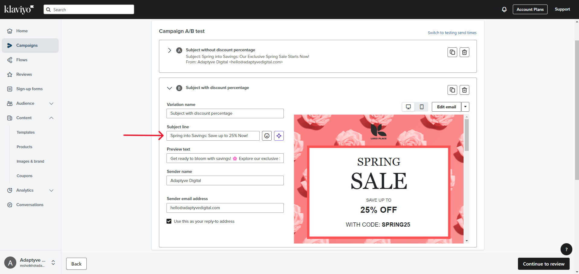 All done! We've set up an A/B test in our Klaviyo campaign to see if adding the discount percentage to our subject line improves the open rate.