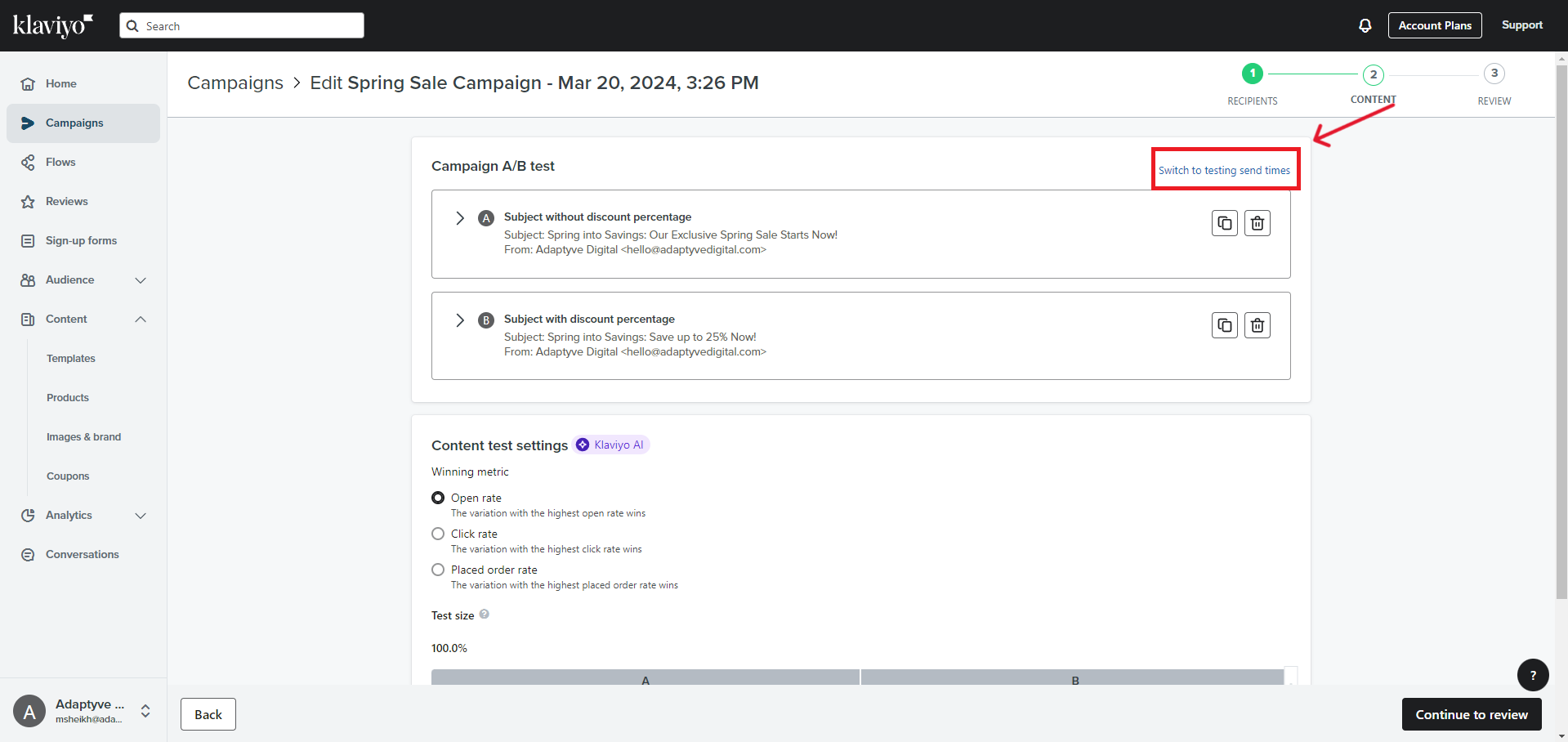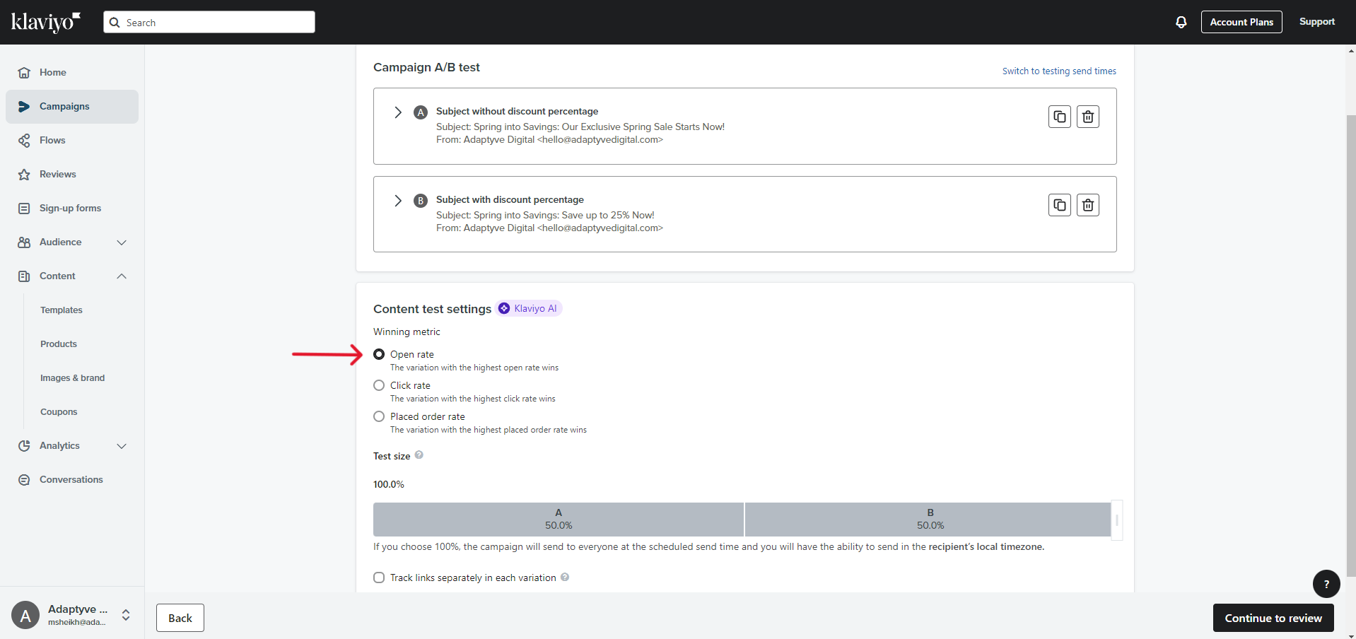 When choosing the winning metric, select the metric you want to see improve. In the example above, we chose open rate because we were curious if adding the discount percentage in the subject line would get more customers to open the email.