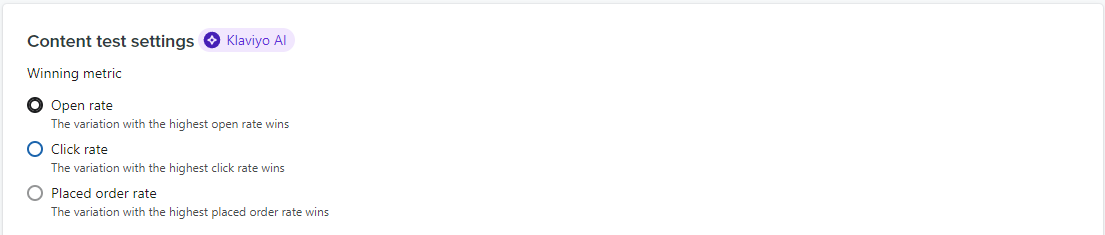 - Click rate - Choose this if you're testing content inside the email, like the layout, images, or your call-to-action button placement.