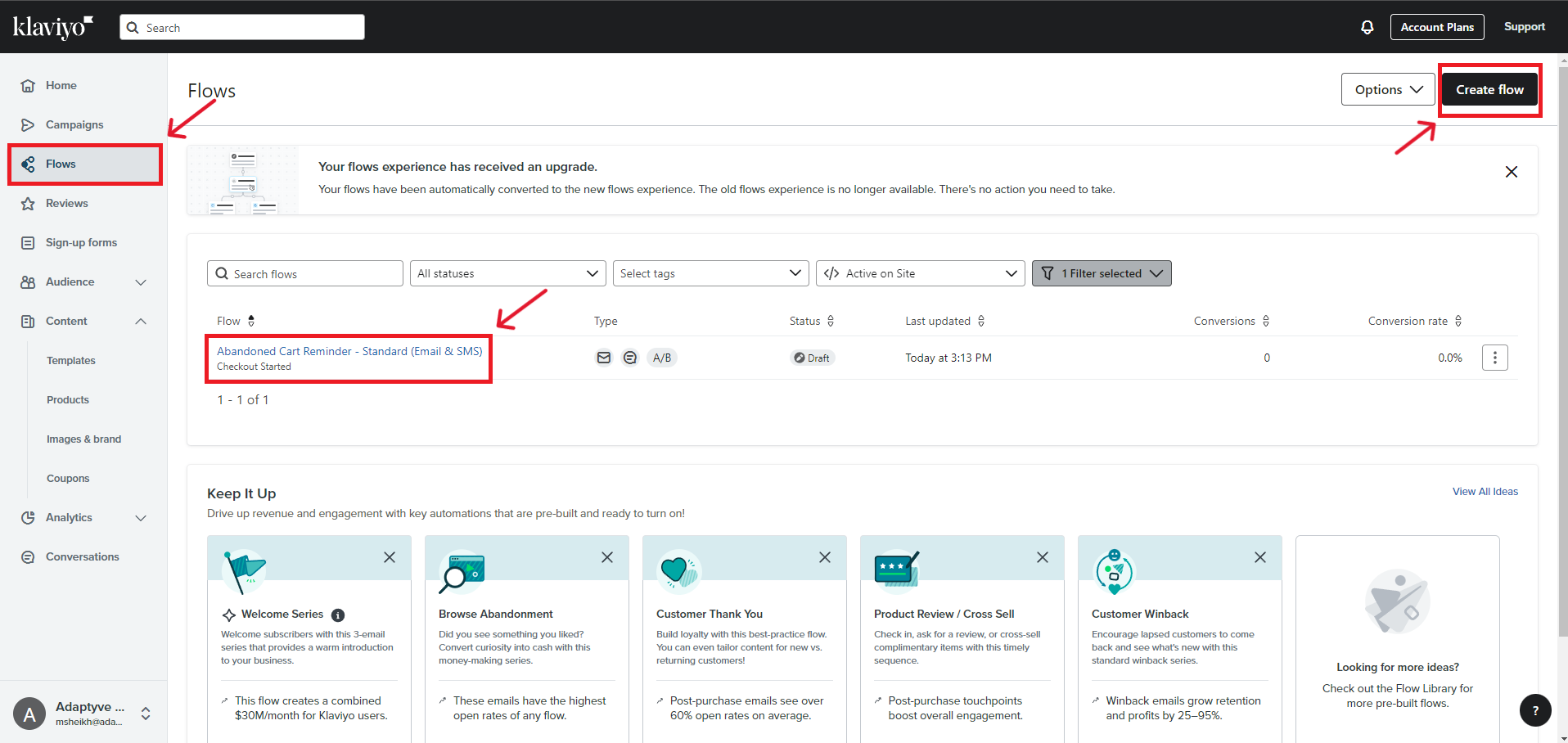 - In Klaviyo, click "Flows" in the left-hand menu. Select an existing flow or click the "Create flow" button.
