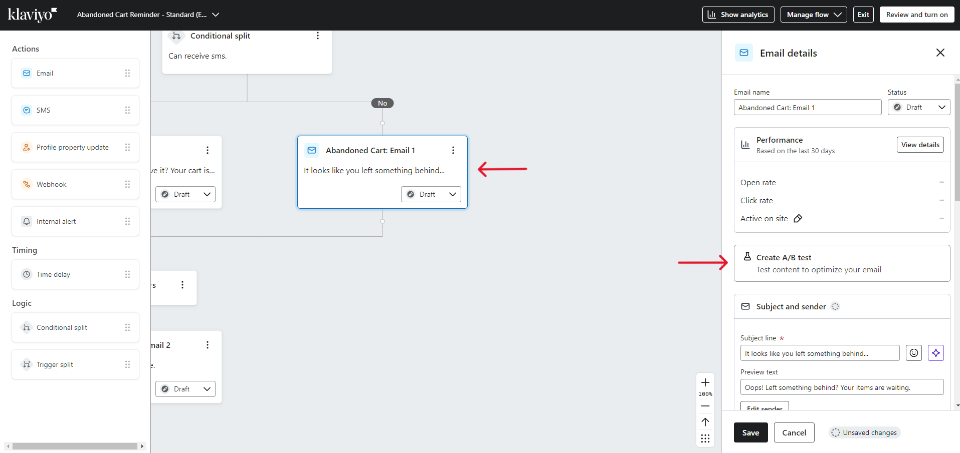 Now, let's look at how to set up A/B tests for your flow emails. In this example, we'll again set up a subject line A/B test to see which subject line leads to more opens for our abandoned cart flow emails.