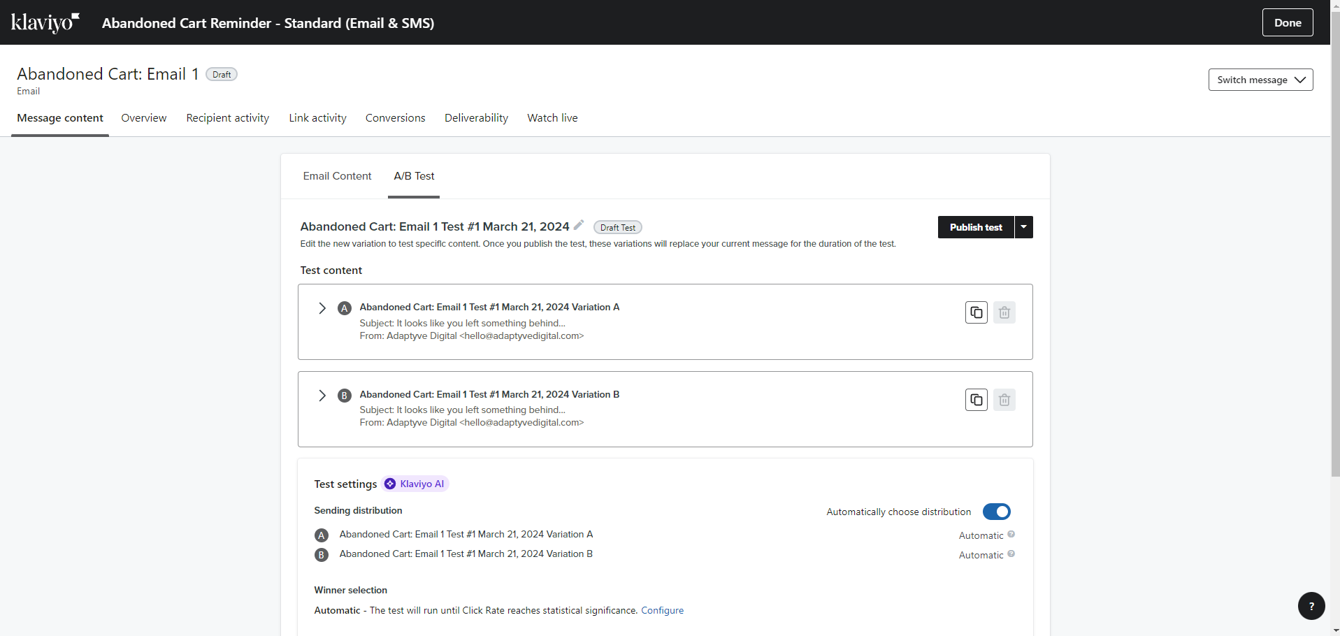 - This creates a second variation of your email and takes you to the A/B Test tab on the Message content page.