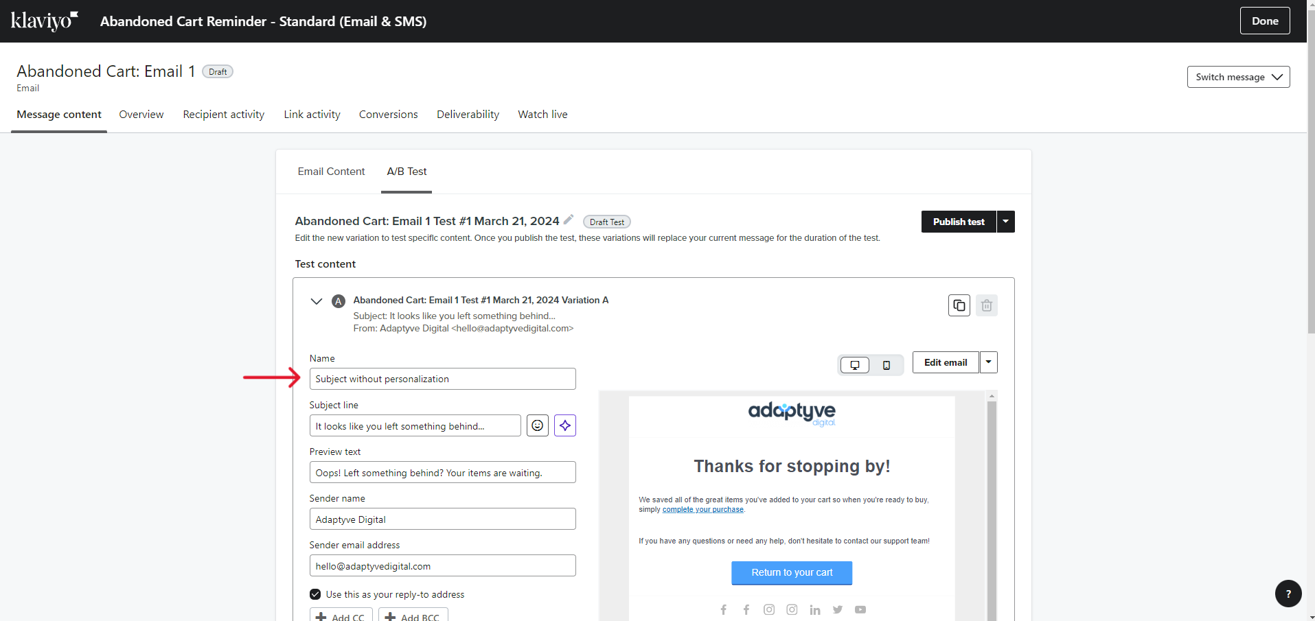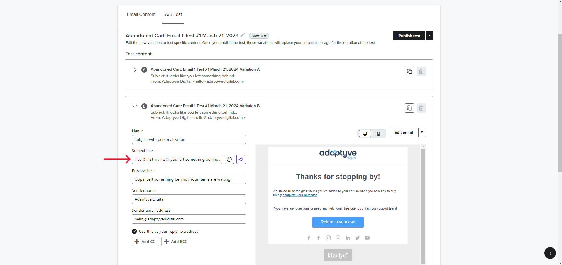 - Under Variation B, enter the subject line you want to test. In this example, we're testing the subject line "Hey {{ first_name }}, you left something behindβ¦". Remember, it's important to test only one variable at a time, so don't change anything else.