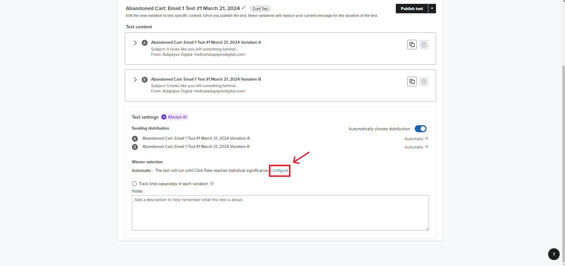 - Next, we'll tell Klaviyo how to choose the winner. By default, tests automatically choose a winner based on click rate. In our case, we're curious if the personalized subject line improves the open rate, so we'll need to change the winner selection metric. Click the "Configure" link under winner selection.
