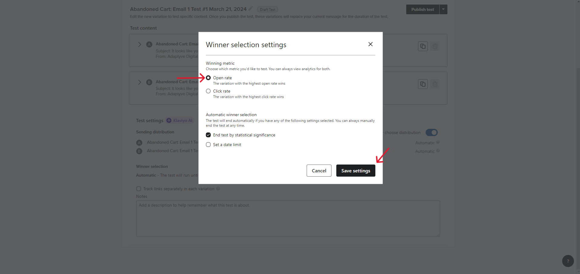 - In the winner selection settings modal, click "Open rate." Then, click the "Save settings" button.