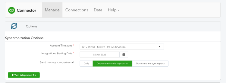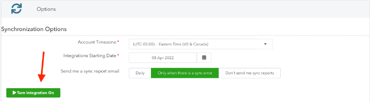 Congratulations, you made it! The final step is to click the green "Turn Integration On" button and allow the magic of background sync automation to send all your revenue and sales to your Quickbooks bank feed.