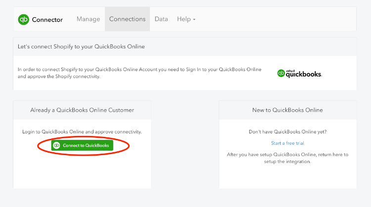 After the app finishes installing you will land on a connection screen. This is where you will give permission for your Shopify store to connect securely to your QuickBooks account.