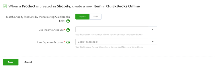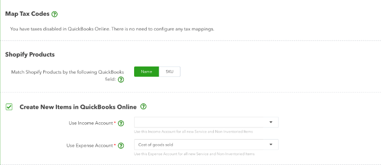 Match Shopify Products by the following Quickbooks field - You have to make a decision that will be hard to change in the future. The option you select here will be how product and inventory items are matched in the user interface across both platforms.