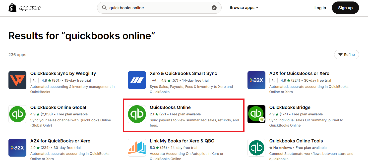 Search the Shopify app directory for "Quickbooks Online." Find the app with the Quickbooks logo by Intuit and click it.