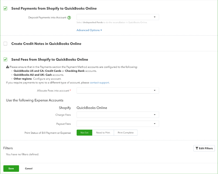 Use Expense Accounts - This is the Quickbooks expense account where you want to record the fees charged to Shopify sellers for payment processing. You will most likely select "bank fees and service charges" here.