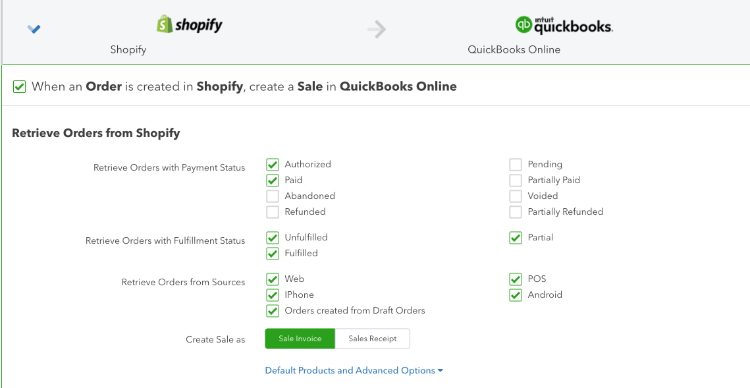 Retrieve Order with Payment Status - Check the boxes you want to trigger a sync to your Quickbooks account. Authorized and Paid are checked by default. You may want to also include Refunded, Partially Refunded, and Voided transactions so you can reconcile your income with your bank accounts.