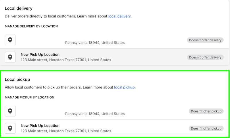 On this page, you'll see all of your store's shipping and delivery settings. To finish setting up our pickup locations, we'll want to focus on the Local pickup section.