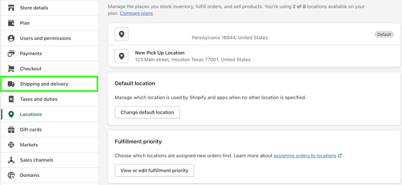 Let's head over to the shipping and delivery page in Shopify. This is where you can change the pickup settings for your locations.