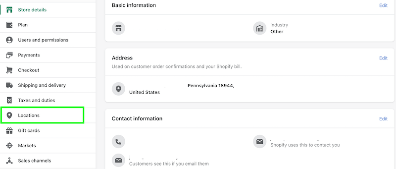 First, let's head over to the Locations page in Shopify. This page lists all the locations associated with your Shopify store. It is also where you can add, update, or remove locations.