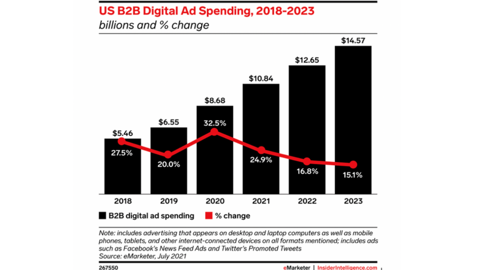 B2B digital marketing spending has grown rapidly for the past five years. According to eMarketer, by 2023, nearly half of the $30.6 billion spent on B2B marketing will be digital. On top of that, for the first time ever, more than half of B2B marketers' digital spending will be focused on mobile devices versus non-mobile devices. Total spend on display advertising is also expected to surpass search advertising.