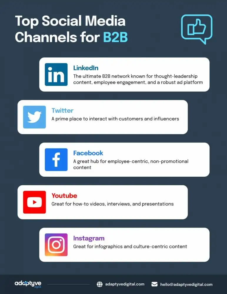 When starting out, it's important not to spread yourself too thin by trying to be on every platform at once. Instead, focus on the top 2 or 3 channels where your target audience is most active. To help you out, here's an infographic showing the top social media platforms for B2B brands.